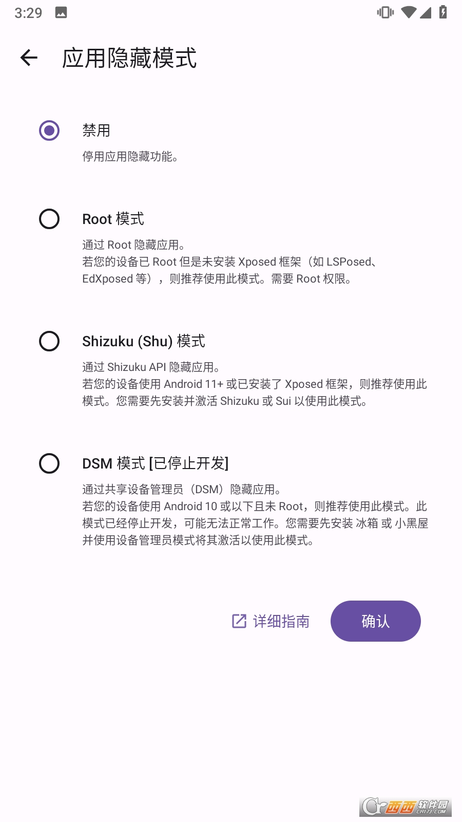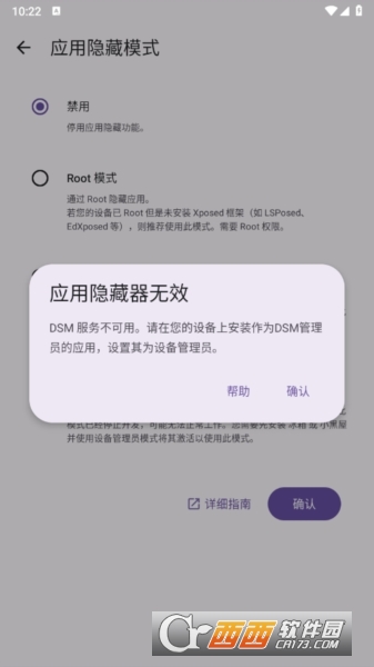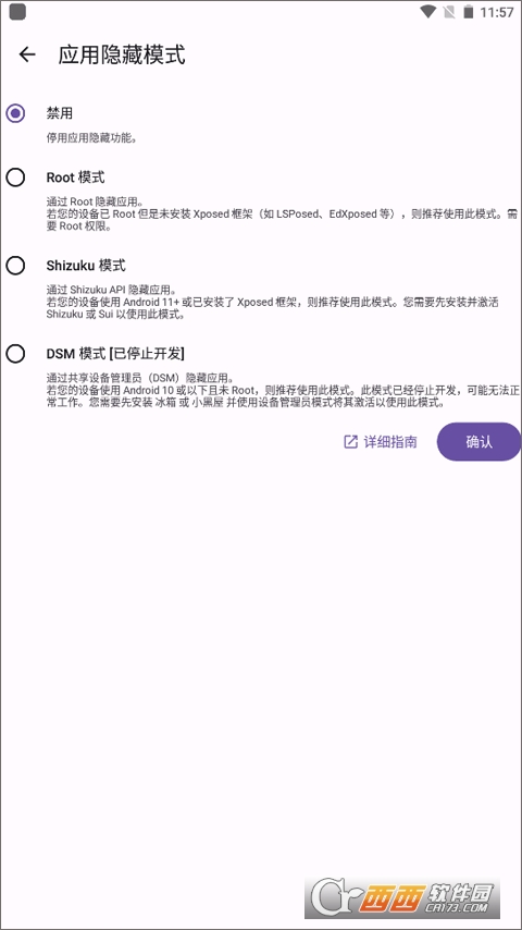 多模式应用隐藏,支持 Root、Shizuku/Sui、DSM 等多种应用隐藏模式,灵活兼顾 Root、免 Root 不同设备的使用需求,还有实验性 Dhizuku 模式可选,适配更多小众设备环境。