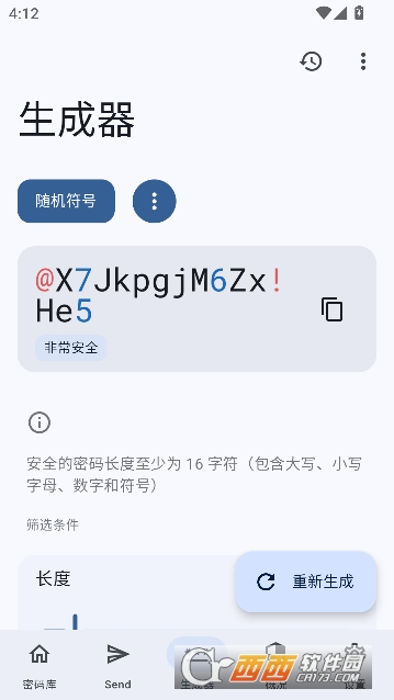 内置安全密码生成器,可生成 16 字符以上含大小写、数字、符号的高复杂度随机密码,还支持自定义筛选密码长度,一键重新生成,从源头保障各类账户密码的安全性,满足不同平台的密码设置要求。