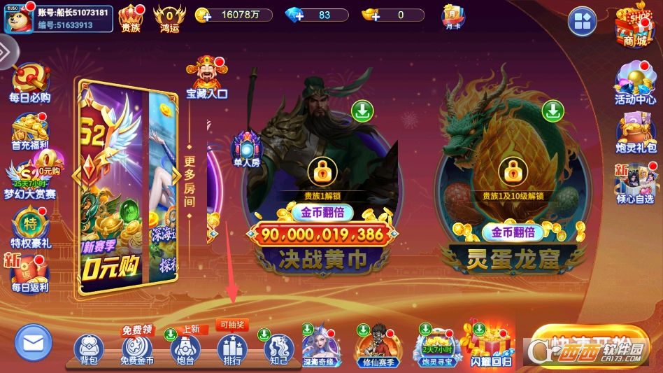 第二种是竞技排位模式(诸神大战),属于核心竞技模式,玩家以自己的炮台与宠物阵容为基础,参与全服段位赛匹配,与其他玩家进行实时对战,对战过程中需根据敌方操作与鱼群分布,调整炮台倍率与射击策略,赢得比赛可获得段位积分与丰厚奖励,段位越高,奖励越丰厚,设有青铜、白银、黄金、钻石等多个段位,适合追求竞技快感、想证明自身实力的玩家。