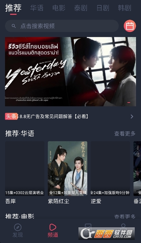 首页按“泰剧推荐”、“华语热播”、“日韩剧场”、“美剧风潮”等板块展示内容。