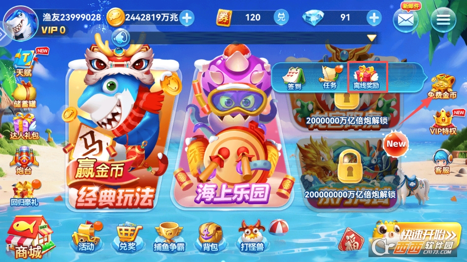 A:可通过捕获鱼类、完成日常任务、参与福利活动等方式免费获取金币,每日登录还能直接领取大量金币,同时开启挂机模式也能持续积累金币,无需充值也能满足日常游戏需求。