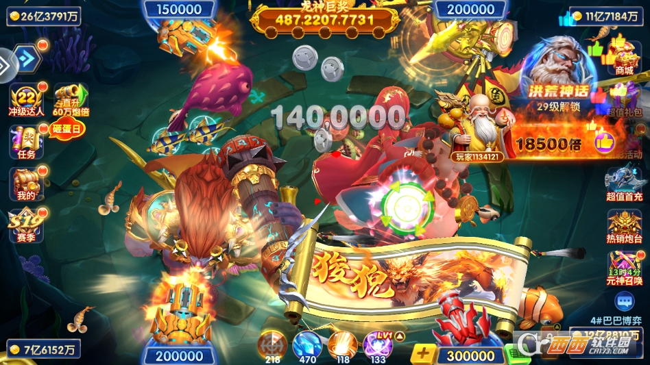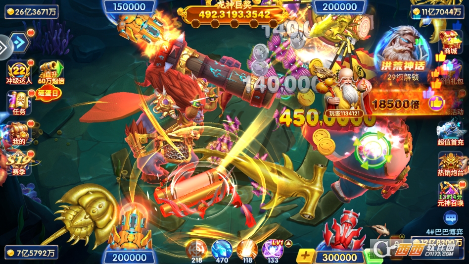 BOSS围捕挑战,定期刷新黄金鲨、机械鲨、暗黑魔龙等强力BOSS,BOSS体型庞大、奖励丰厚,捕获后可获得大量金币、炮台升级材料与稀有道具,支持单人挑战或组队围捕,合力击败BOSS可解锁额外爆金奖励。