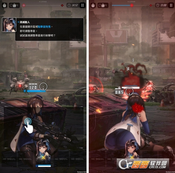 1、作为一款第三人称视角的枪战动作游戏,《胜利女神:NIKKE》强调的是从背后操作妮姬们进行射击,在画面显示区域中点击并拖曳就能调整准星射击,若暂停射击或子弹不足会自动换弹,同时也要注意敌人的攻势,随时躲到掩体背后防御,但要小心掩体受损过重就会遭到破坏。