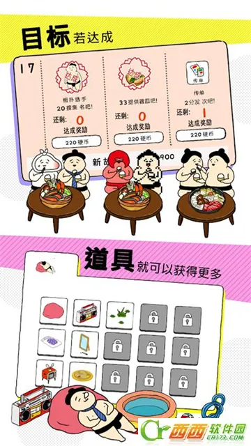 2. 招揽相扑选手吃饭不易,需点击右下角,进度条满才吸引来一位客人,赚取金币可开发菜品、买家具。