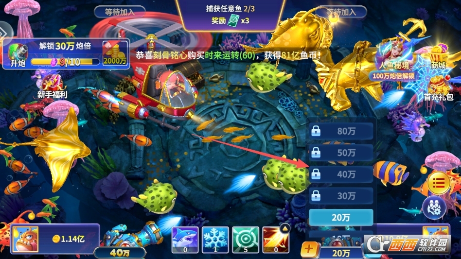 内置锁定、冰冻、狂暴、全屏等实用道具,可针对性捕捉目标鱼群、减速BOSS、提升火力,大幅提升捕鱼效率。