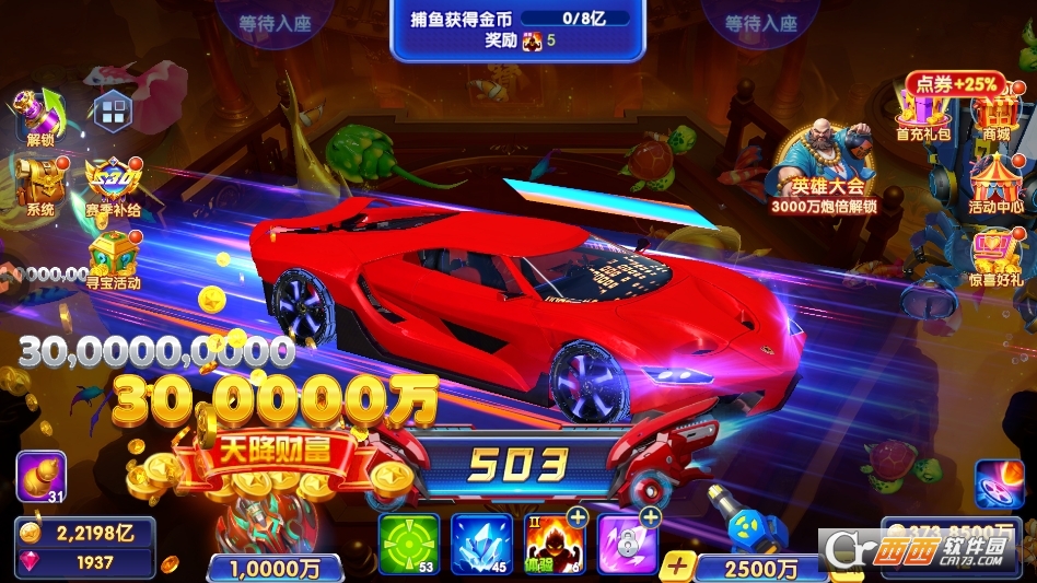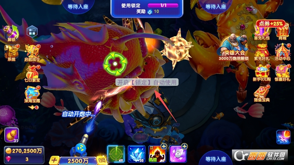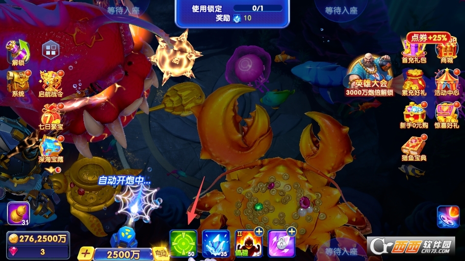 王者之战:游戏核心竞技赛事模式,分为报名期、比赛期与结算期,玩家缴纳报名费即可参赛,比赛中通过捕获鱼类积累积分,最终根据积分排名发放金币、钻石、稀有炮台皮肤等丰厚奖励,赛事定期开启,是玩家展示实力、争夺荣誉的核心舞台。