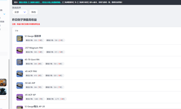 同步游戏内真实交易行数据,子弹、钥匙卡、配件等物资价格秒级更新,展示最新成交价、涨跌幅度、历史走势。提供价格预警、收益分析功能,帮玩家判断物资买卖时机,低买高卖赚取差价,实现游戏内资源增值。