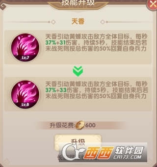 唯一主动: 天香引动黄蜂攻击敌方全体目标,每秒造成一定数额伤害,持续5秒。技能结束后若没战死则回复总伤害值得50%的自身兵力。