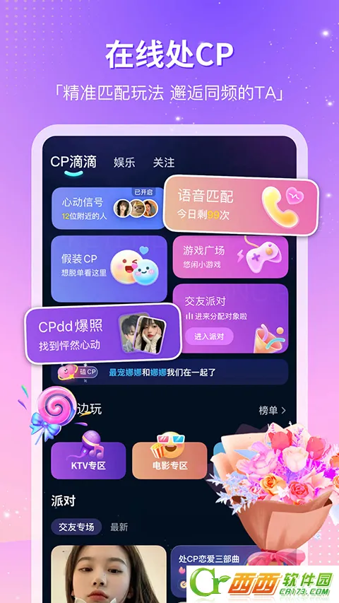 CP滴滴是一款社交恋爱互动平台,专为年轻小伙伴打造。在这里,能轻松匹配到兴趣相投的异性。它有很多有趣的游戏模式,让交友不再尴尬枯燥。通过它,你可以方便地在线约会找对象,它就像同城约会助手,帮你找到比邻佳缘。同城单身男女云集,智能定位,能让你快速找到有缘人,让约会交友变得轻松简单。其功能特色丰富,寻缘配对好玩又高效,一键快速发起聊天。超级表情趣味斗图,让聊天增添乐趣。还有动态广场,能分享生活,即时聊天可语音连麦、视频通话,互动更生动。软件信息经过筛选验证,安全放心。比如v4.38.0版本有梦幻环游奖励调整等更新。总之,CP滴滴能满足你社交恋爱找对象的需求,带来便捷又有趣的交友体验。
