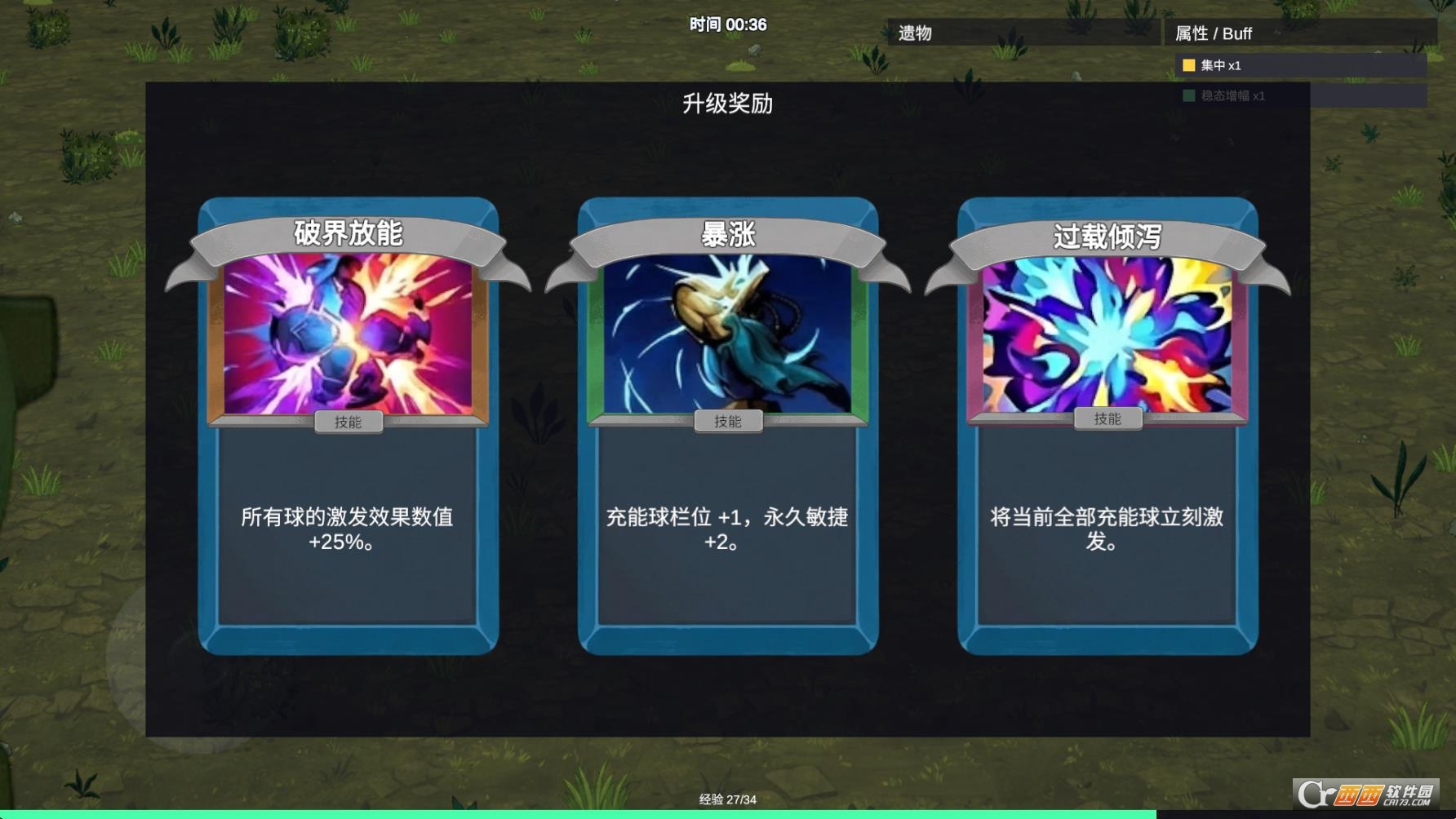 击败怪物能获取经验值,经验累积提升等级后,可从卡牌池中选择一张卡牌,获得对应的属性或技能效果加成,每张卡牌的 buff 效果不同,能针对性强化角色的不同能力。