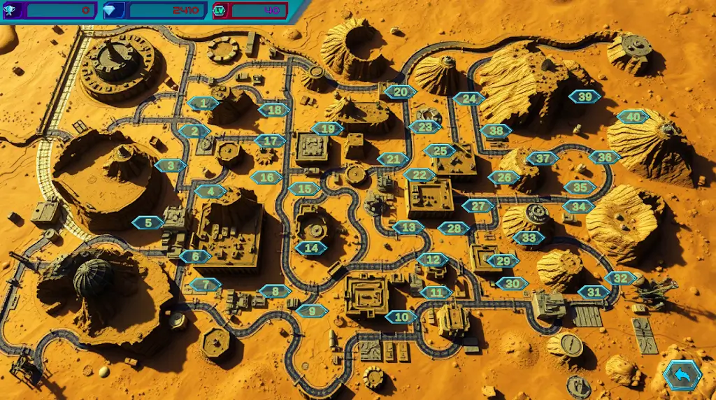 3. 地图场景丰富:地图以红棕色和暗橙色为主,模拟火星荒漠地貌,穿插火山口、裂缝和岩石障碍,每关地形布局不同,增加探索性与战略考量。