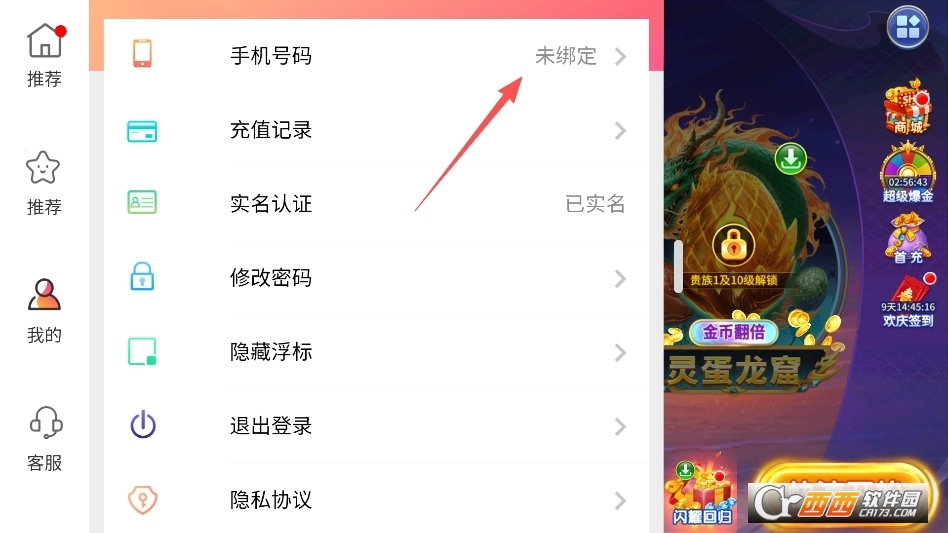 即可呼出设置菜单,点击菜单中的绑定账号即可绑定你的手机号