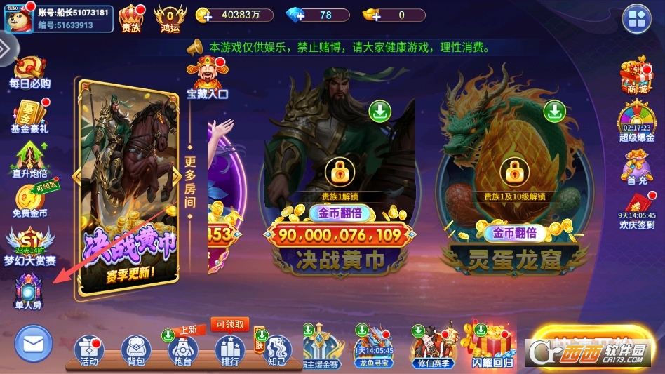 进入游戏后在选择渔场的界面,点击单人房按钮即可创建单人房