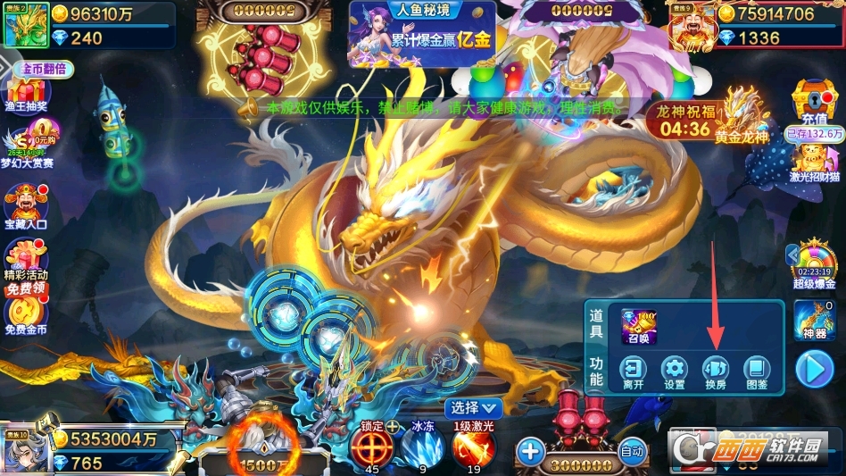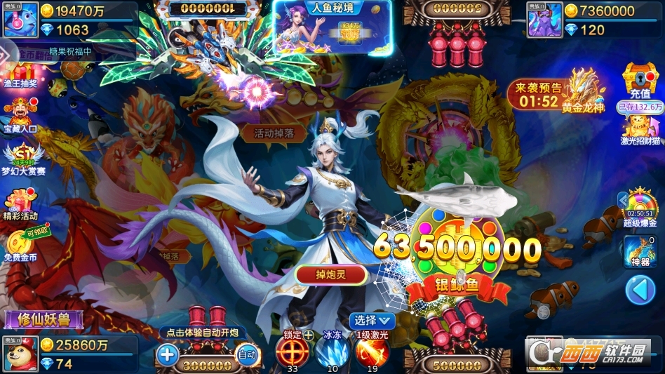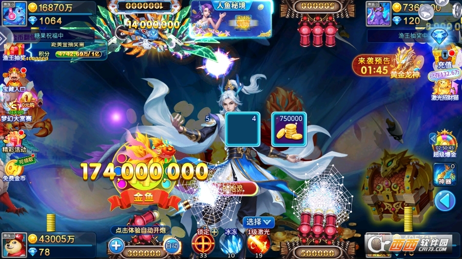 技能辅助玩法。游戏内置多种实用辅助技能,随玩家等级提升逐步解锁,包括狂暴技能(短时间提升炮台威力与射速)、冰冻技能(冻结全屏鱼群,方便精准瞄准)、全屏炸弹(一次性清除小范围鱼群)等。技能使用需消耗少量金币或道具,冷却时间短,合理搭配技能使用,能大幅提升捕获效率,尤其应对密集鱼群或高倍BOSS时,效果事半功倍。