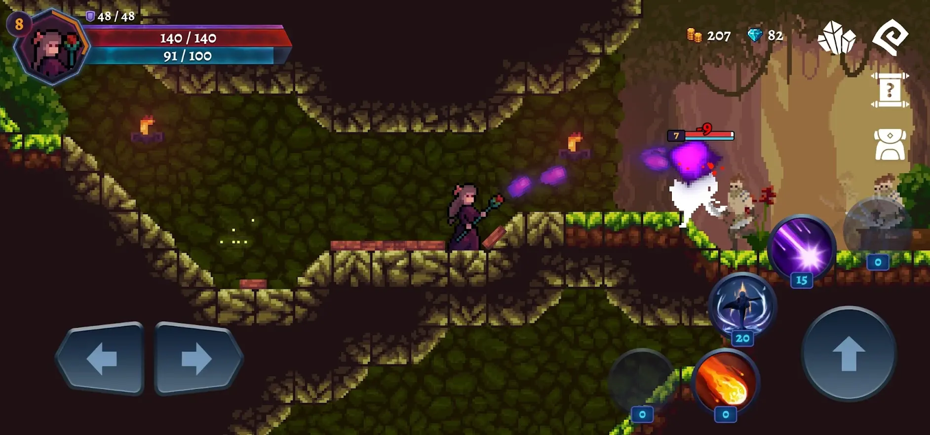 横版闯关 + 野区刷怪,养成循环推进:左侧移动、右侧跳跃 / 冲刺 / 技能,闯关推主线、接 NPC 任务;击杀怪物获取经验、金币、装备,升级解锁技能,铁匠处强化 / 镶嵌宝石,逐步提升战力挑战更高难度地图与 BOSS。