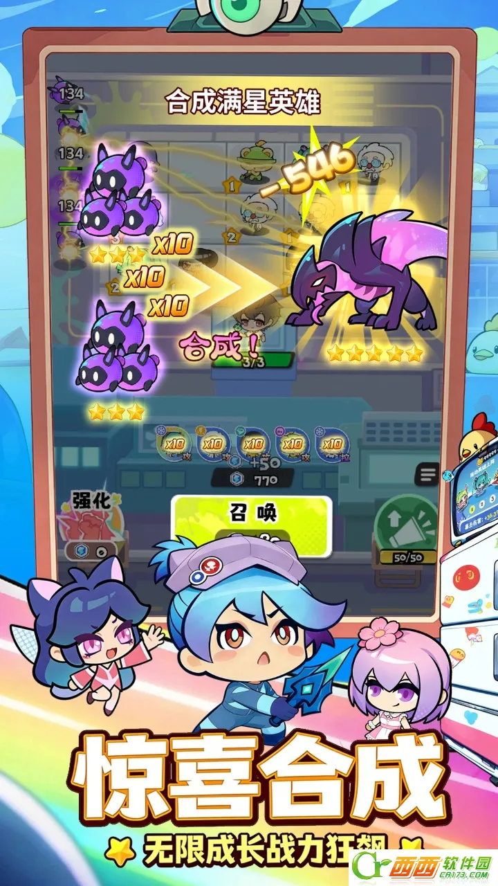 2、召唤英雄玩法有趣,随机召唤增加不确定性,合并强化提升战斗力,充满策略性。