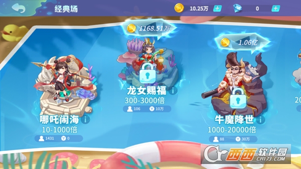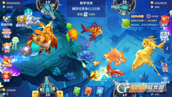 1、倍率炮台系统:炮台倍率从1倍到1000倍自由调节,倍率越高,捕获大鱼时的金币收益越惊人,但消耗炮弹金币也越多。
