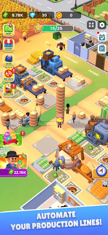 3、闲置玩法零压力,离线时农场机械和工人持续工作带来收益,上线领取奖励扩展农场规模。