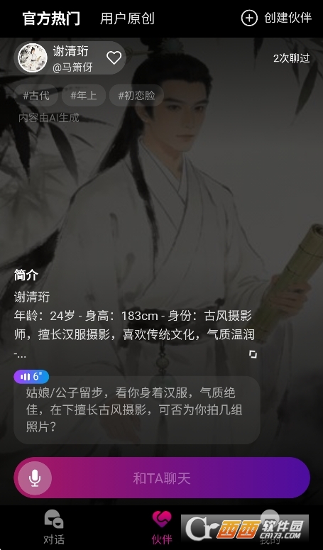 每位AI角色配有专属的背景故事——校园同桌、职场前辈、异世界冒险者、古风侠客、未来战士……与不同的角色对话,仿佛穿梭于不同的世界与故事之中。