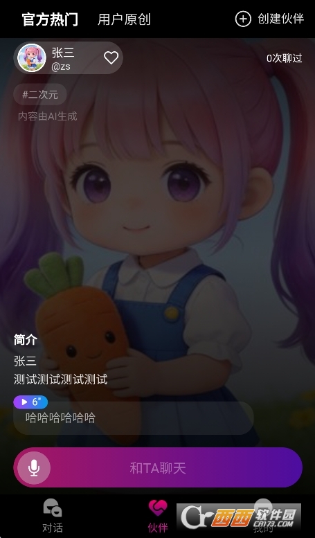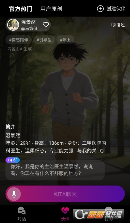 1、角色广场:浏览所有预设AI角色,可按性格类型、人气热度、新上线等维度筛选。点击角色头像即可开始聊天。