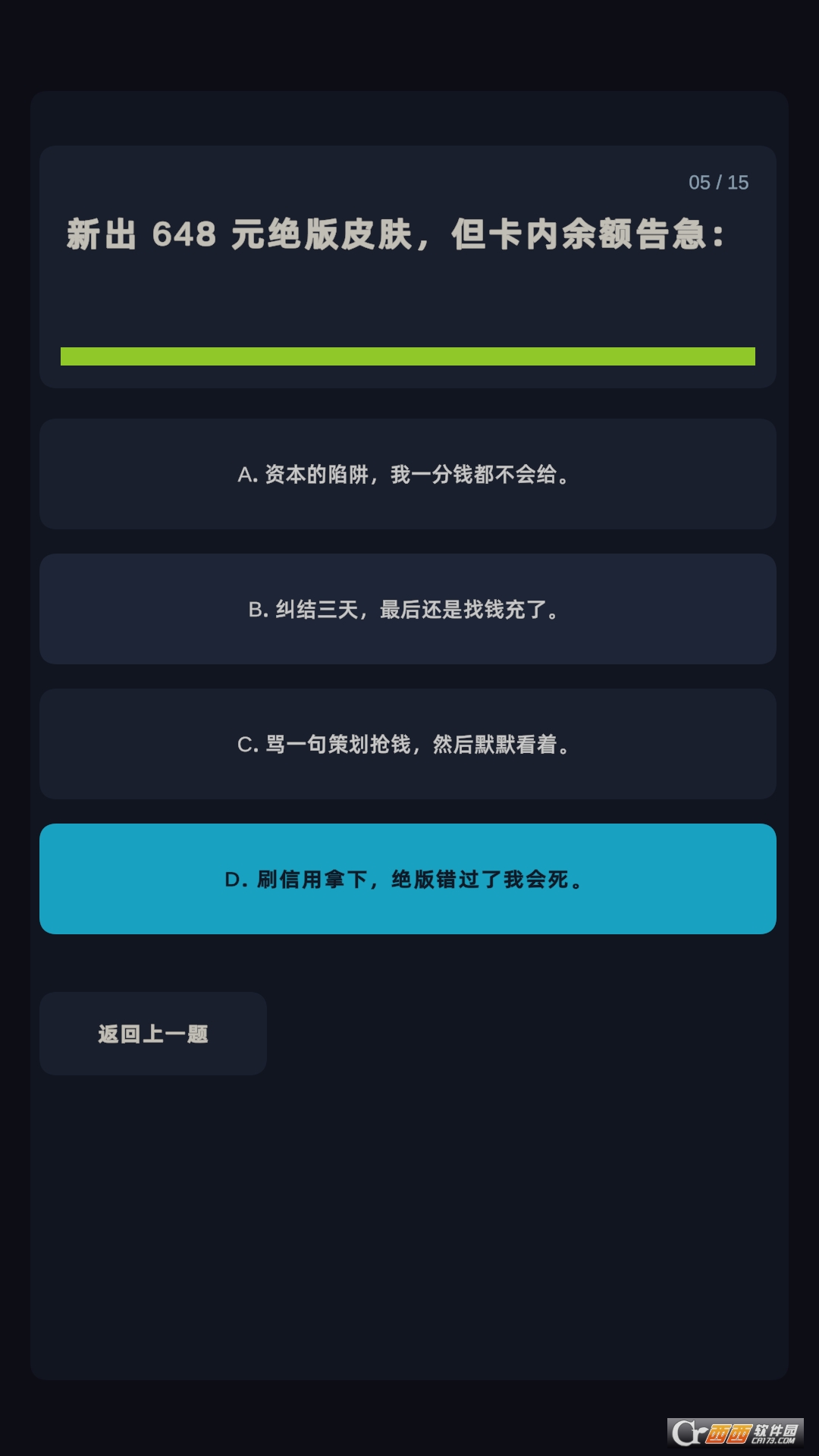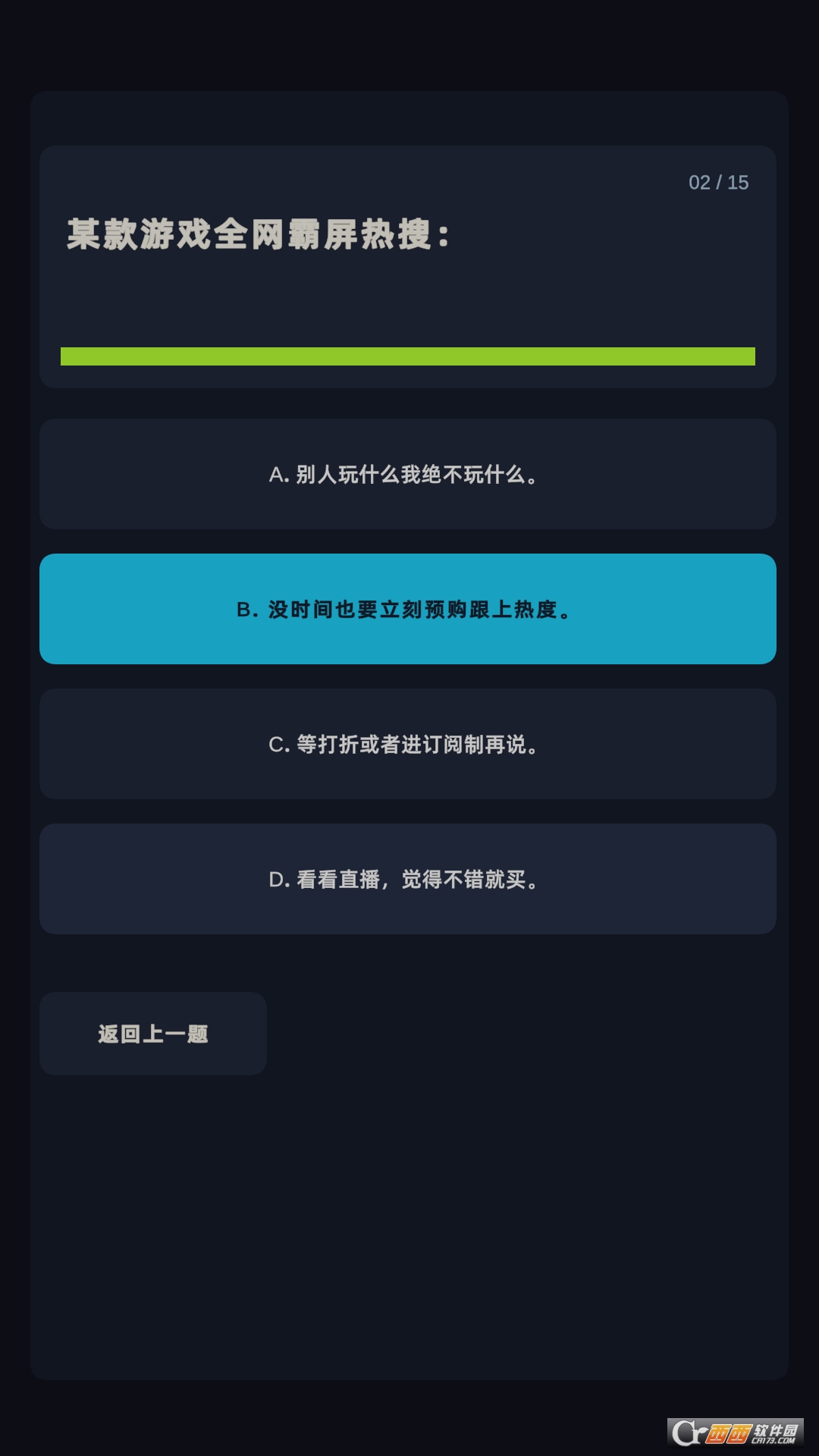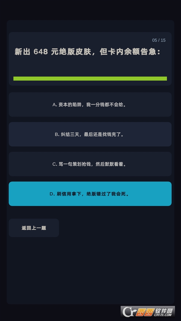 选择答案:在屏幕上出现的题目和选项中,直接点击你认为最符合自己的选项即可。