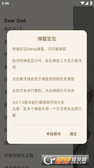 DeerGod是一款功能十分强大的安卓会员XP模块工具。这款模块主打系统优化与应用功能增强,专为安卓玩机用户打造。具备去广告、解锁各类应用会员权益、捕捉应用弹窗等实用能力。还内置便捷悬浮球机制,实现弹窗持久拦截、自动跳过启动界面等效果。整体功能全面、实用性强,能够深度美化和提升安卓手机日常使用体验,是玩机爱好者常备的专业模块工具。