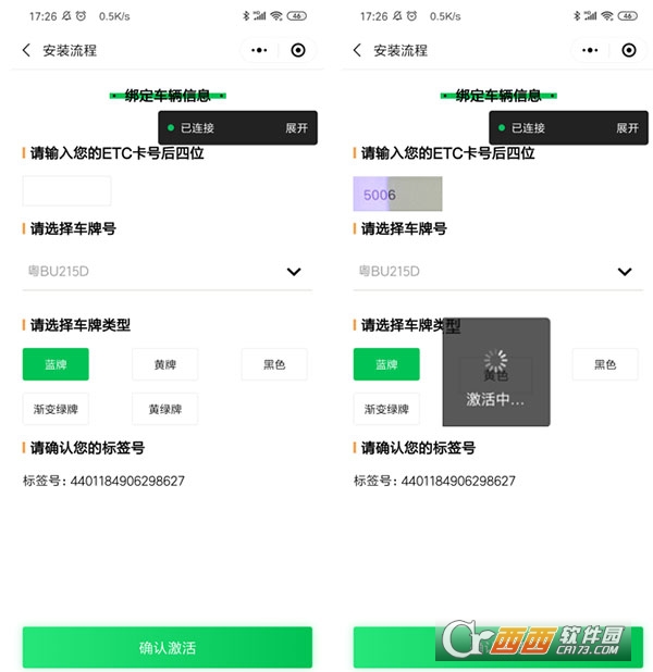 建立蓝牙通信后,用户选择其要激活的车牌号与车牌颜色,该步骤将通过手机向OBU交互写入用户的申请数据;并由OBU向卡片写数据,所以卡片一定要插在OBU里。确保申请与激活的手机账号为同一个,否则无车辆数据展示。