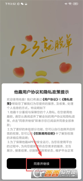 1、打开应用后就会弹出各种协议框,点击同意并继续就能进入登录页面。