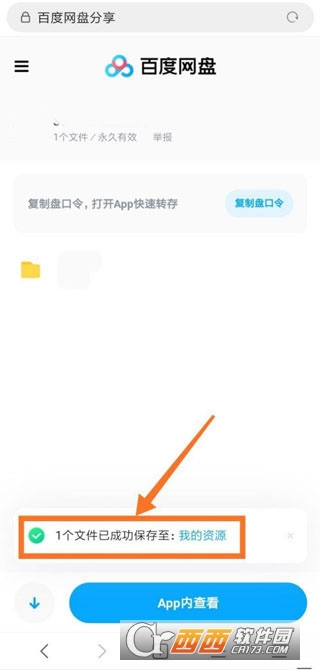 4、百度网盘文件保存成功后,界面如下图所示,箭头处即可看到文件已经成功保存至“我的资源”。