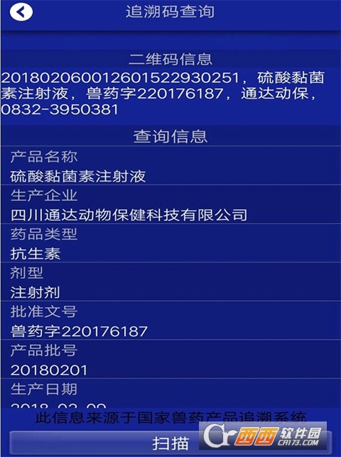 2、通过扫描兽药产品的追溯二维码,通过APP 可以查询到二维码的完整追溯信息,