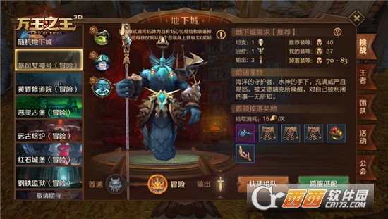 在《万王之王3D》游戏中,有地下城这个神奇的地方,在这里,可以开启许多冒险之旅,今天我们的主角暴风女神号就是其中之一。暴风女神号副本分为普通、冒险和王者三个等级,这三个等级除了难易程度和所获奖励的物品有所出入外,过关方式都是一样的,今天就以冒险模式为例来给大家介绍一下。
