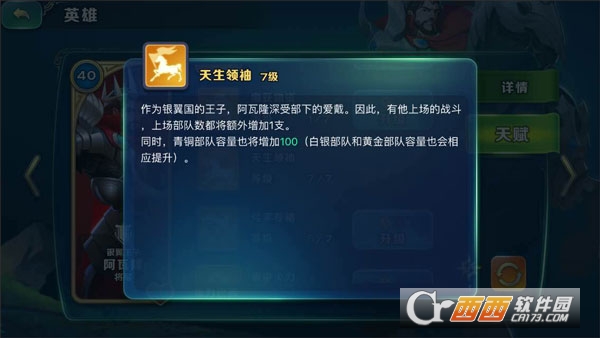 3、阿瓦隆,自带光环的骑士,能增加弓手的攻击力,“集中火力”打BOSS必备,最重要的是 “天生领袖”这个天赋,对于新手来说,这个天赋非常重要,能提高你上场部队的数量,以及提高你青铜部队、白银部队、黄金部队的容量,正所谓千金难买一人口,这个天赋一定要点,还有“缴纳物资”这个天赋,能在战斗后额外获取资源,在前期战力和体力有限的情况下,也是不错的选择,阿瓦隆看似辅助型英雄,但前中后期都有不同方向的高收益;