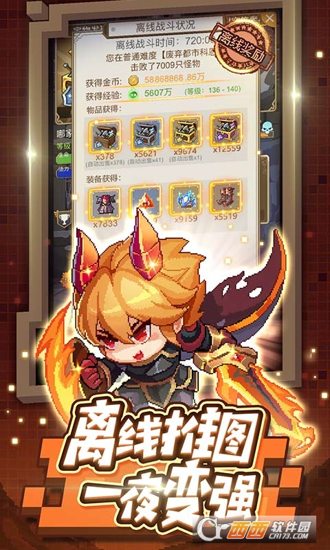 作为一款放置RPG游戏,我们希望能你可以在快节奏的生活工作之余轻松提升勇者,打败一个又一个魔物,最终攀登难度的巅峰,打败邪恶魔神之王,拯救家园!