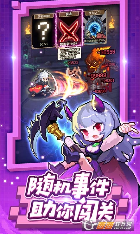 随机事件随机出现!只要轻轻一点事件即可提高战力、削弱魔物攻击、掉落大量金币和钻石!你更可以打开隐藏的各种玩法,体验属于你的神秘的快乐!