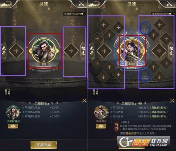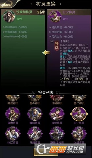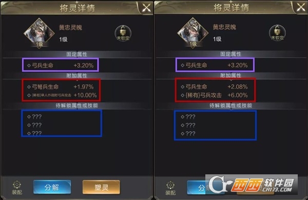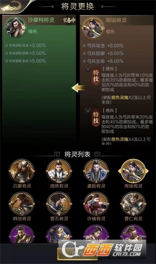 其中低品质的将灵只增加兵种的攻血防三围属性,而紫色和橙色的将灵,不仅加成更高还有自己独有的“特技”。