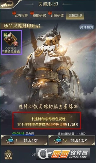 封印方式与招募武将类似,每天有3次免费封印机会,十连封印必得橙色灵魄,五十连封印必得珍品橙色灵魄,还可以选择自己想要的珍品灵魄提升获取概率。
