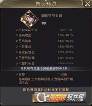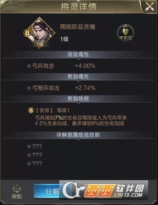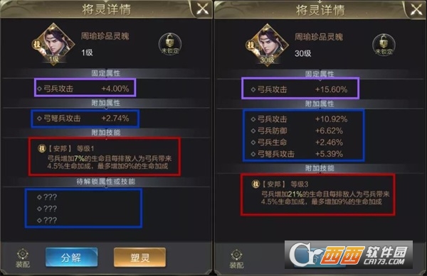 以弓兵的珍品灵魄周瑜为例,将周瑜灵魄从1级提升到30级后,可以看到灵魄的固定属性、技能等级和附加属性均有大幅提升。