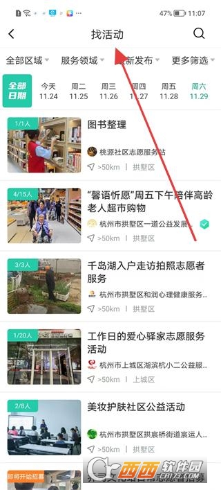 1、进入找活动页面,浏览图书整理超市购物等志愿活动,查看活动的发布机构及区域信息,选择感兴趣的活动类型。
