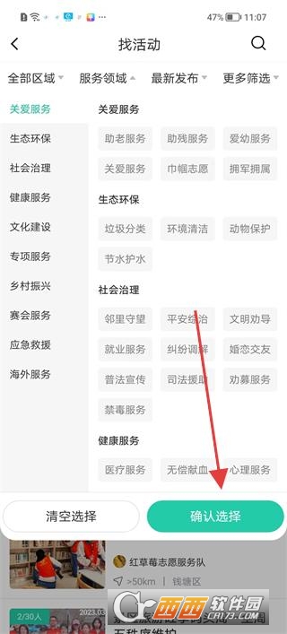 2、点击服务领域按钮选择助老服务心理服务等分类,勾选对应服务类型后点击确认选择,筛选出匹配的志愿活动。