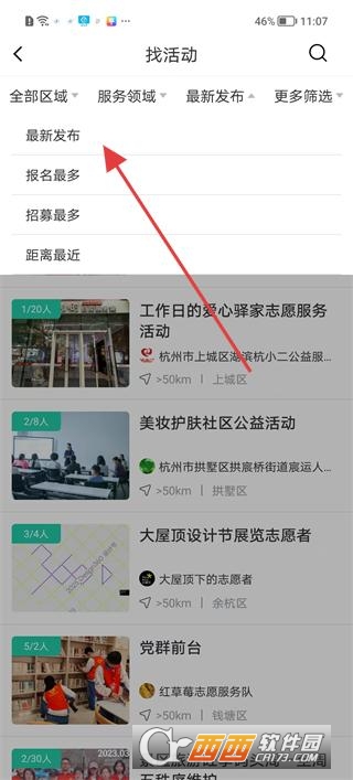 3、点击最新发布按钮切换报名最多招募最多等排序方式,浏览排序后的志愿活动列表,查看活动的参与人数及区域。