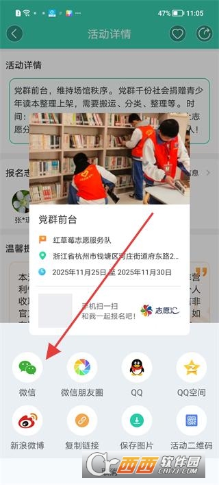 4、进入活动详情页查看党群前台等活动的时间地点信息,点击分享按钮选择微信朋友圈等渠道,分享该志愿活动信息。