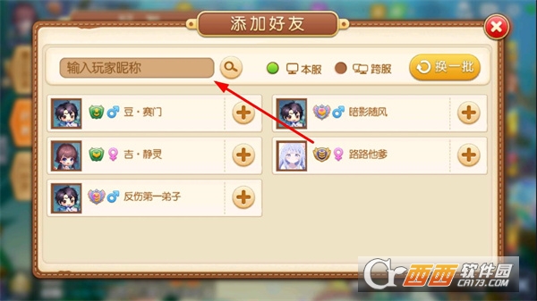 3、在添加好友页面,可以在搜索框中输入玩家昵称进行精准查找,也可以点击换一批浏览推荐玩家,然后点击玩家发送好友申请。