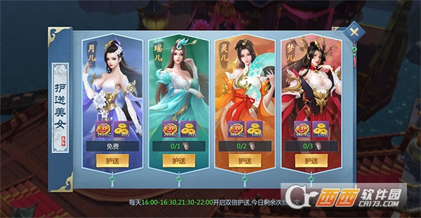 玩家每日可参与3次,根据拥有的护花令数量选择要护送的美女,越高级的美女护送成功可获得的经验越高,每天16:00-16:30、21:30-22:00开启双倍护送,收益更高!