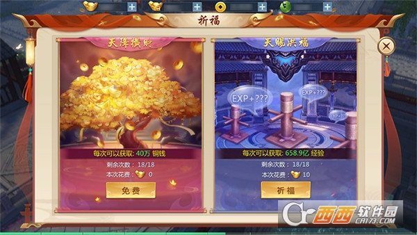 玩家每日可以消耗元宝进行10次经验祈福,快速获得大量经验,VIP玩家可以获得更多购买次数。