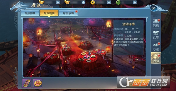 帮派活动包括帮派神兽、帮派晚宴、守卫帮派等等多样玩法,需要公会成员一起参与、共同协力战斗才能完成,完成后可以获得神兵,装备,大量经验等奖励。