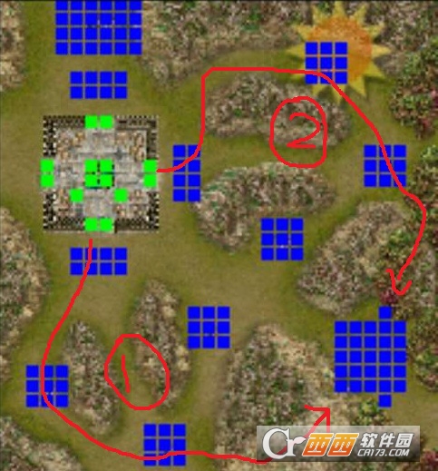 本关考验玩家的输出能力。第二回合刘感死后走剧情,显示要求守城至秦王入城。第四回合李世民大部队赶到。前十回合的主要任务是守城以及清兵,不能出城。可以让一个人站在红色方块守正门,建议李世民或者令箭枪兵,其余人全部往左侧以及左下靠拢,同时加好强行,准备第十一回合出城。蓝圈部分会有无限复活的破甲副将,只要让红色方块处的人别杀死他们就行,让他们在城门罚站。红圈部分各有一波伏兵。本关MVP是刺客套侯君集。侯君集可以直接进下城切医生。此处有个小技巧:下城城外的boss可以等侯君集进城触发伏兵后再杀,这样就不用杀第二次。上城城外的boss要先杀掉才会触发城内伏兵。下城清完后立刻出城杀小薛。上下城都清完后城门口的兵不会复活,下城的人再杀上去就好。全灭无撤退奖励祝融巾。二周目全灭过关奖励柴绍成长点,有皮肤再额外奖励两点。