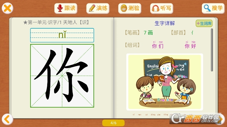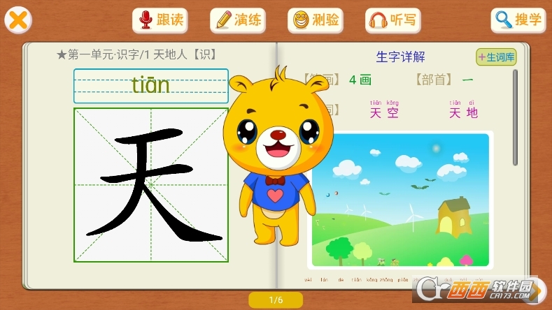 (2)汉字、拼音均可点读发音,书写演示,学生不仅可以认汉字、学拼音,还可以练习汉字和拼音的书写。