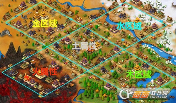 整个大陆地图按照五行分为五个区域,每个区域都有其独特的建筑玩法: