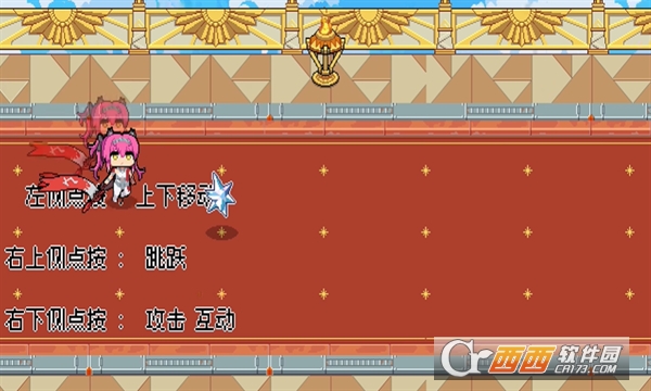 1、下载并进入游戏,开始游戏,游戏基础操作:左侧点按:上下移动、右上侧点按:跳跃、右下侧点按:攻击左侧隐上下移动右上侧点按: 跳右下侧点按: 攻击互动