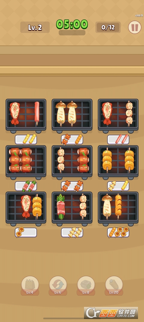 4、三个相同的烤串在同一个烧烤架上即可消除,而且还有多种道具可以使用。